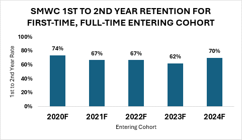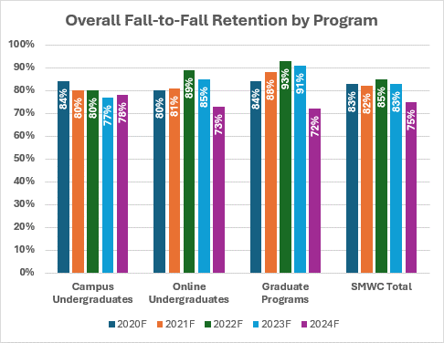 This chart shows the percentage of students who started in the fall and either graduated before or returned for the next fall term. This is considered the overall “Fall-to-Fall” retention.